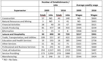 The following chart includes data obtained from the U.S. Government Bureau of Labor Statistics. The tourism industry is represented in the supersector identified as Leisure and Hospitality. Comparing 2005 data with 2016 data identifies that the number of the establishments have stayed the same, jobs have decreased and wages are the lowest of the categories. Perhaps most important, the number of establishment in most categories have decreased with increases in the number of jobs in just a few areas.